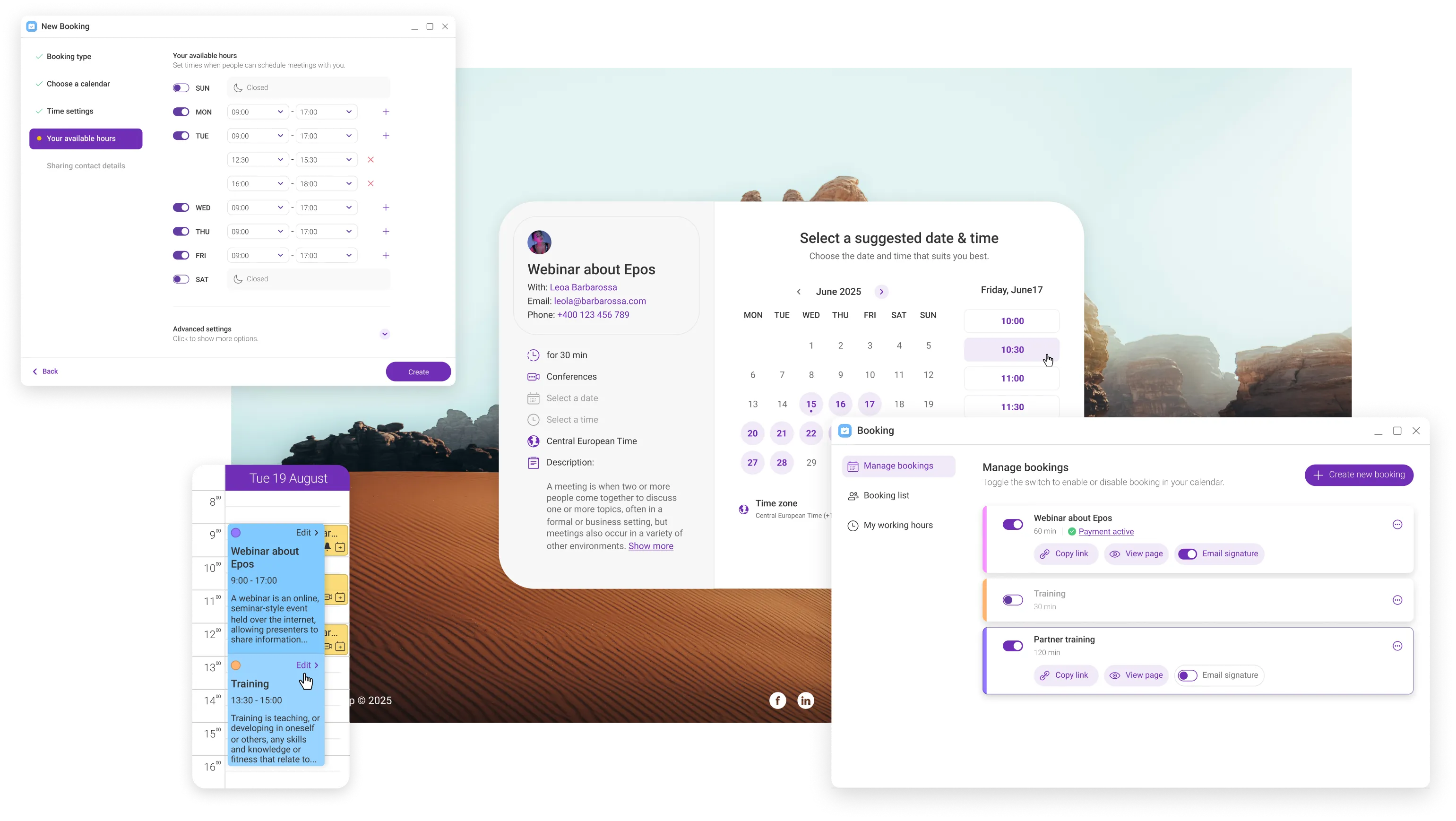 Stay on top of every meeting with an intuitive calendar. Organize your schedule, coordinate with colleagues, and manage events. With Booking, share your availability, invite participants, and let others book meetings in seconds — all in one modern interface that keeps your day running smoothly.