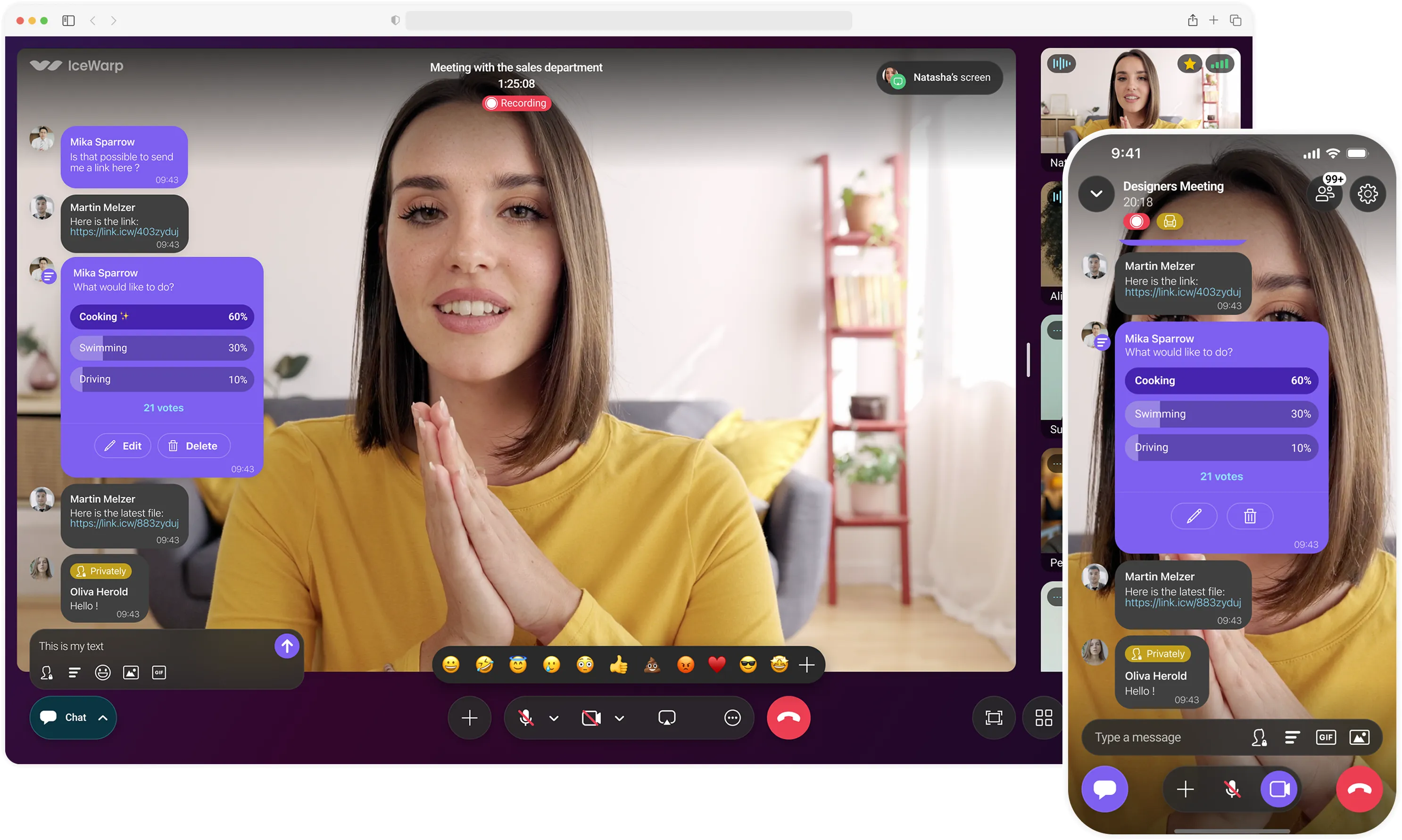 Veranstalten Sie Meetings in IceWarp vom Desktop oder Mobilgerät – ganz ohne zusätzliche Apps. Verbinden Sie sich per Video oder Audio, teilen Sie Ihren Bildschirm, zeichnen Sie Sitzungen auf, chatten Sie, reagieren Sie, führen Sie Umfragen durch und arbeiten Sie in Echtzeit an Dokumenten zusammen.