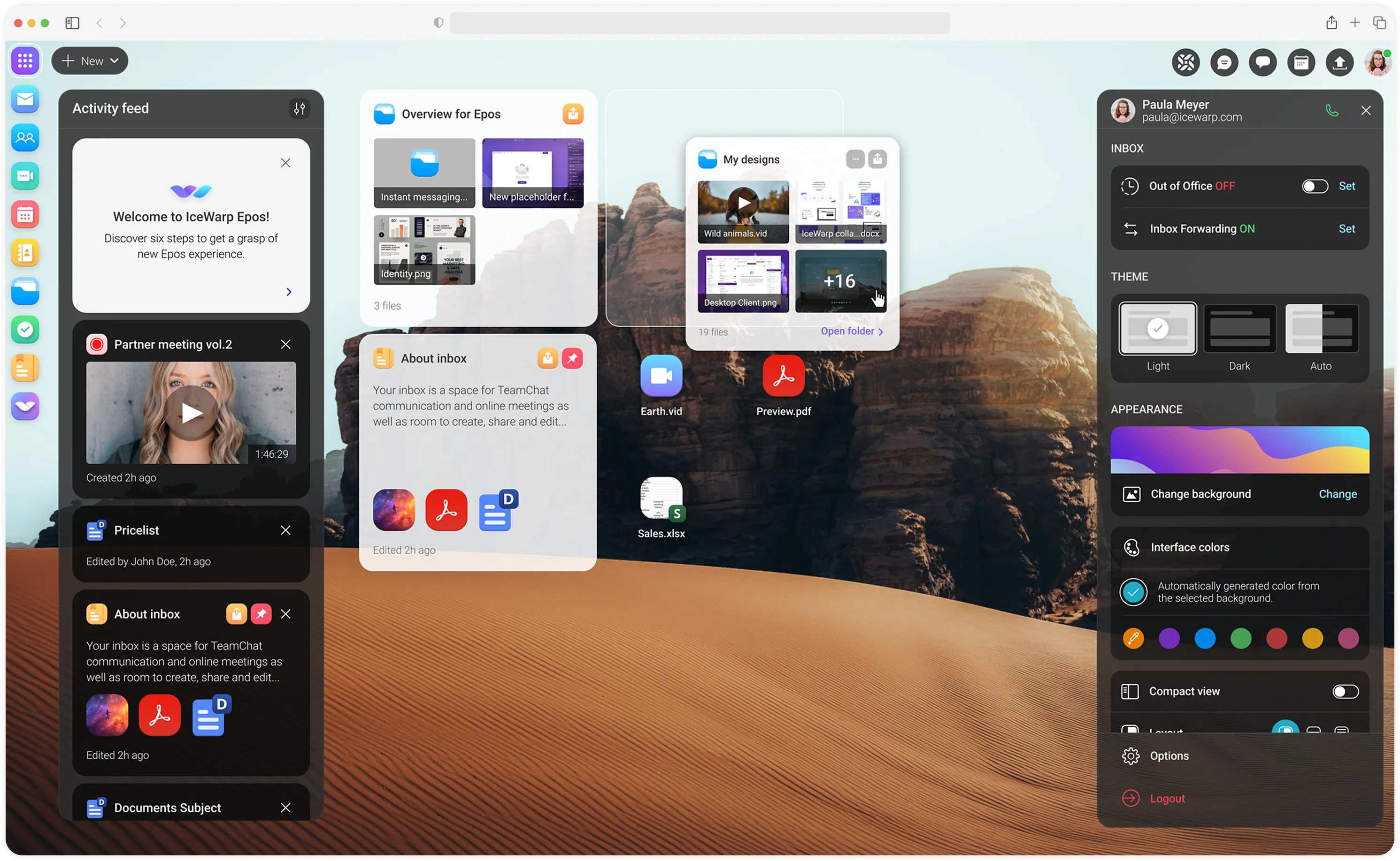 Speichern Sie Dateien direkt in IceWarp und greifen Sie von überall darauf zu – über den Web-Client, die mobile App oder synchronisiert mit Ihrem Desktop-Client für die Offline-Nutzung. Einfache Freigabe für Einzelpersonen, Gruppen oder Gäste.